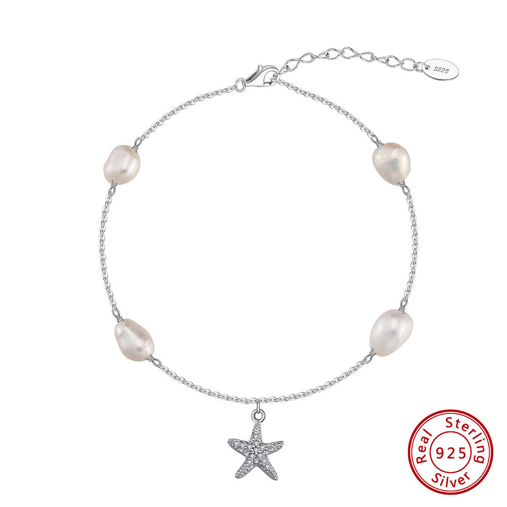 S925 Sterling Silver Beach Style Pearl Five-pointed Star Pendant Anklet